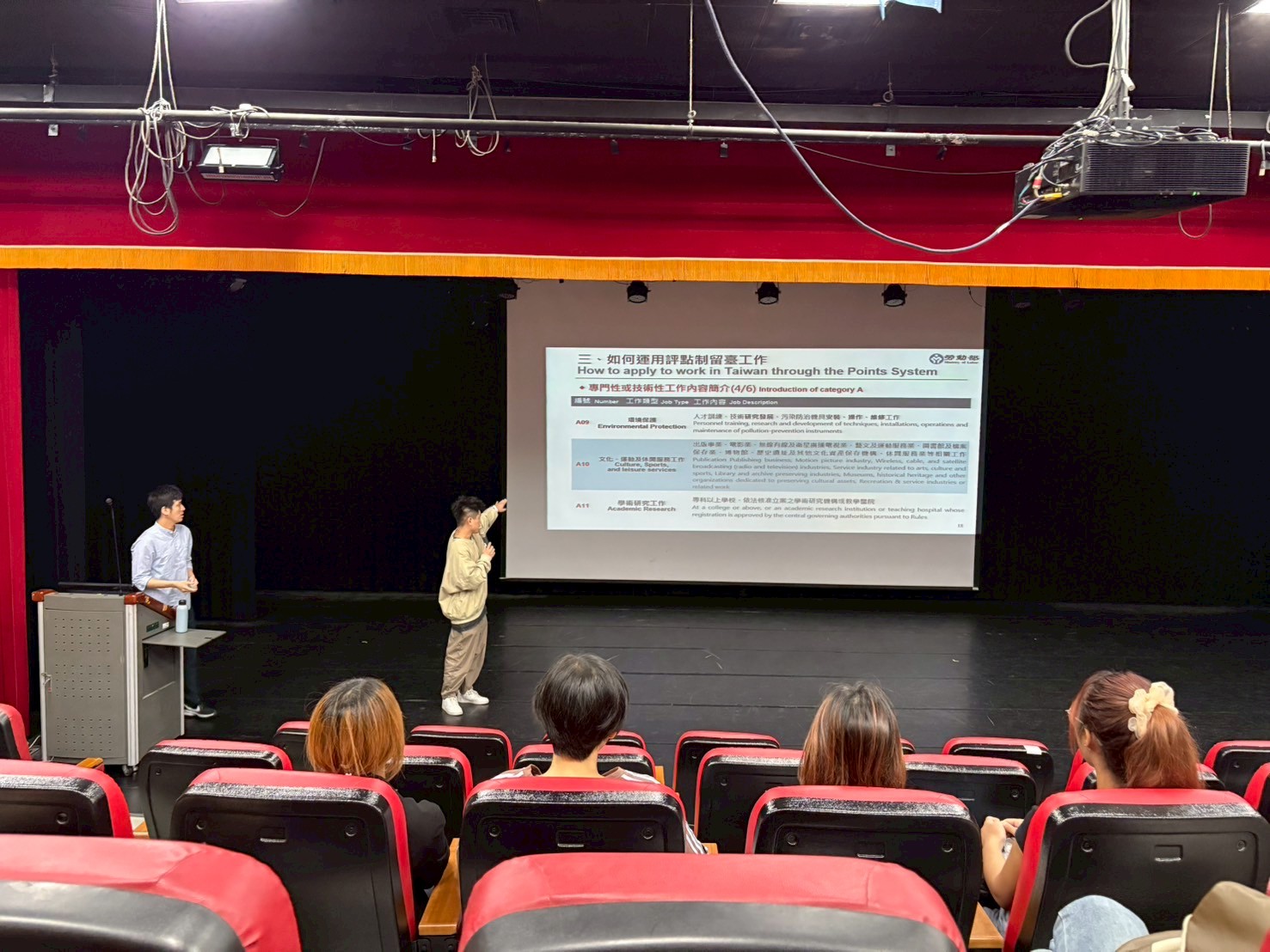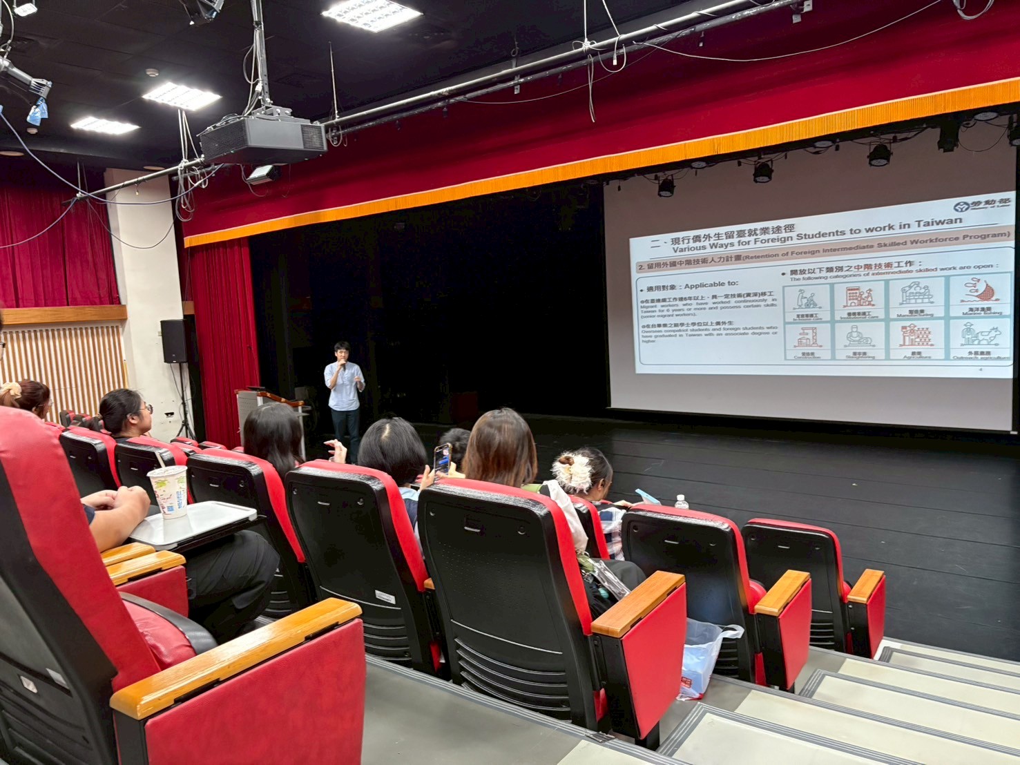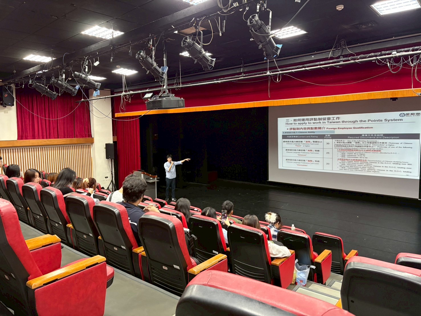 活動邀請勞動部勞動力發展署到校宣導留台評點制、幫助外籍生了解畢業後如何申請留台相關手續。